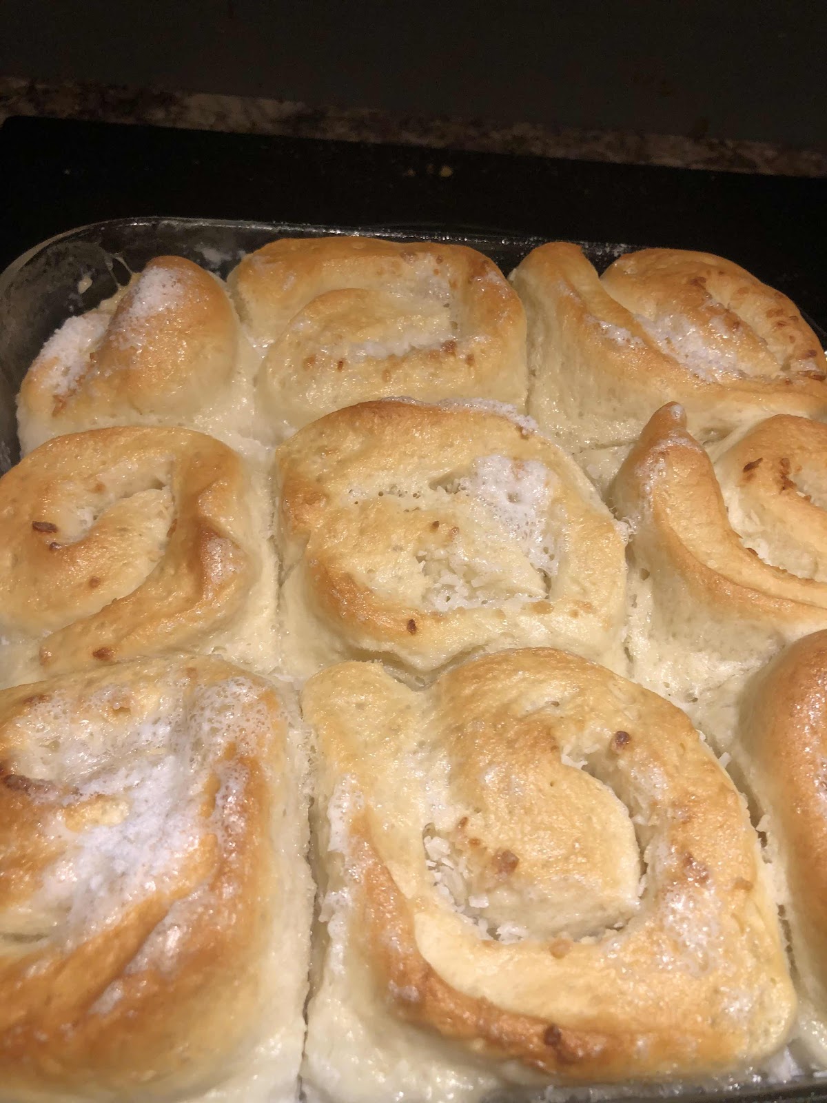 We prefer these made like cinnamon buns. We spread coconut and sugar on the inside and make them in spirals pouring coconut milk on top.